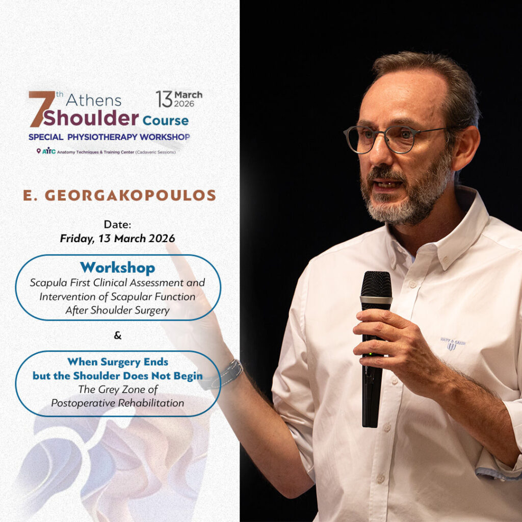 Ο Ευάγγελος Γεωργακόπουλος θα συμμετάσχει στο επιστημονικό πρόγραμμα του 7th Athens Shoulder Course, που θα πραγματοποιηθεί στις 13 – 15 Μαρτίου 2026 στην Αθήνα. Η συμμετοχή περιλαμβάνει: • 10λεπτη επιστημονική ομιλία με τίτλο “When Surgery Ends but the Shoulder Does Not Begin – The Grey Zone of Postoperative Rehabilitation” • Hands on workshop με τίτλο […]